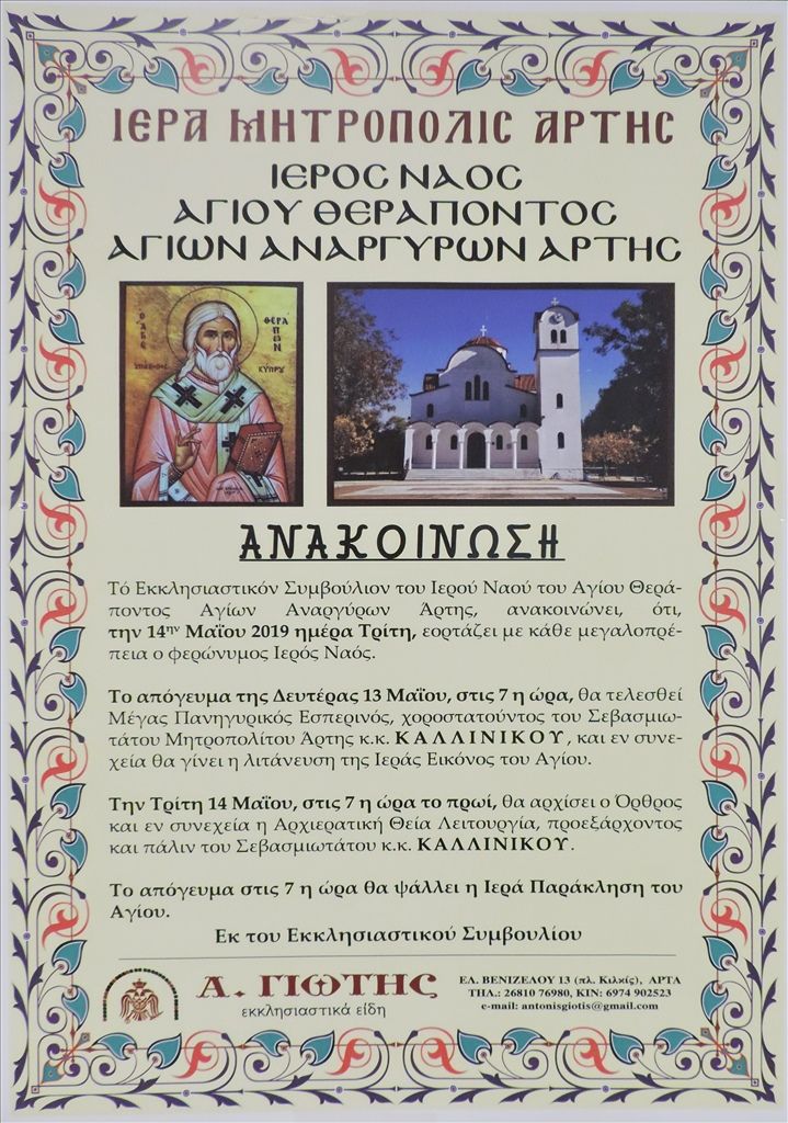 Πρόγραμμα Πανηγύρεως Ιερού Ναου Αγίου Θεράποντος