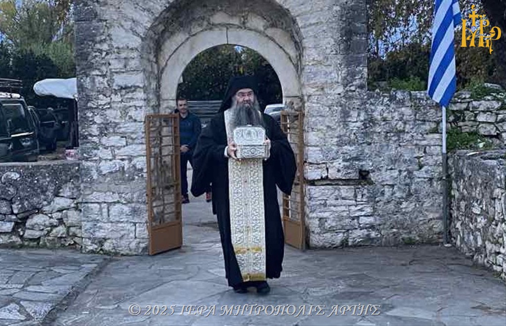 Προ του Εσπερινού, ο Μητροπολίτης Άρτης υπεδέχθη στα προπύλαια του Ναού, απότμημα Ιερού Λειψάνου του Αγίου Λουκά Αρχιεπισκόπου Συμφερουπόλεως και Κριμαίας του Ιατρού, το οποίο θα παραμείνει στον πανηγυρίζοντα Ιερό Ναό έως και αύριο 8 Νοεμβρίου, προς προσκύνηση.
