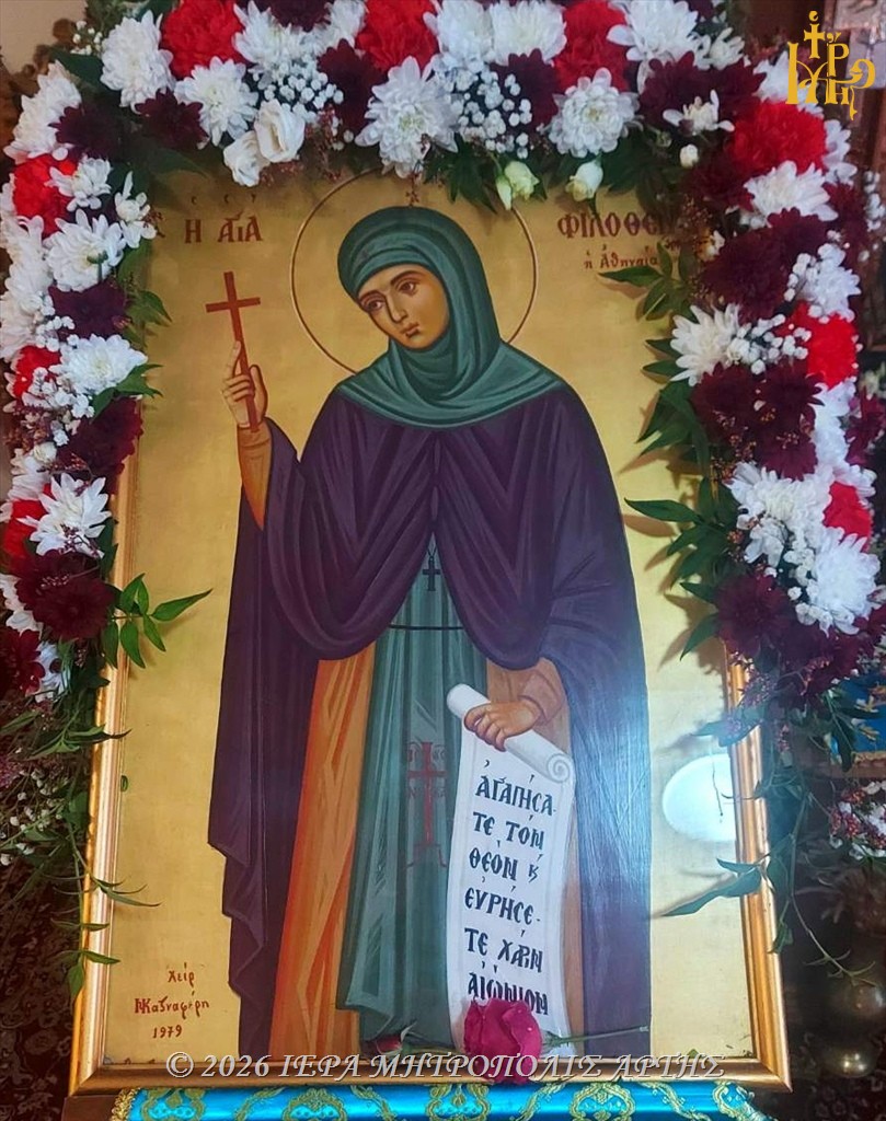 Με κατάνυξη ετελέσθη την Τετάρτη 18 Φεβρουαρίου 2026, το απόγευμα, ο Μέγας Εσπερινός, επί τη μνήμη της Αγίας Οσιομάρτυρος Φιλοθέης της Αθηναίας, στον Ιερό Ναό του Αγίου Ιωάννου του Θεολόγου, στο Πνευματικό Κέντρο της Ιεράς Μητροπόλεως Άρτης, χοροστατούντος του Σεβασμιωτάτου Μητροπολίτου Άρτης κ. Καλλινίκου.
