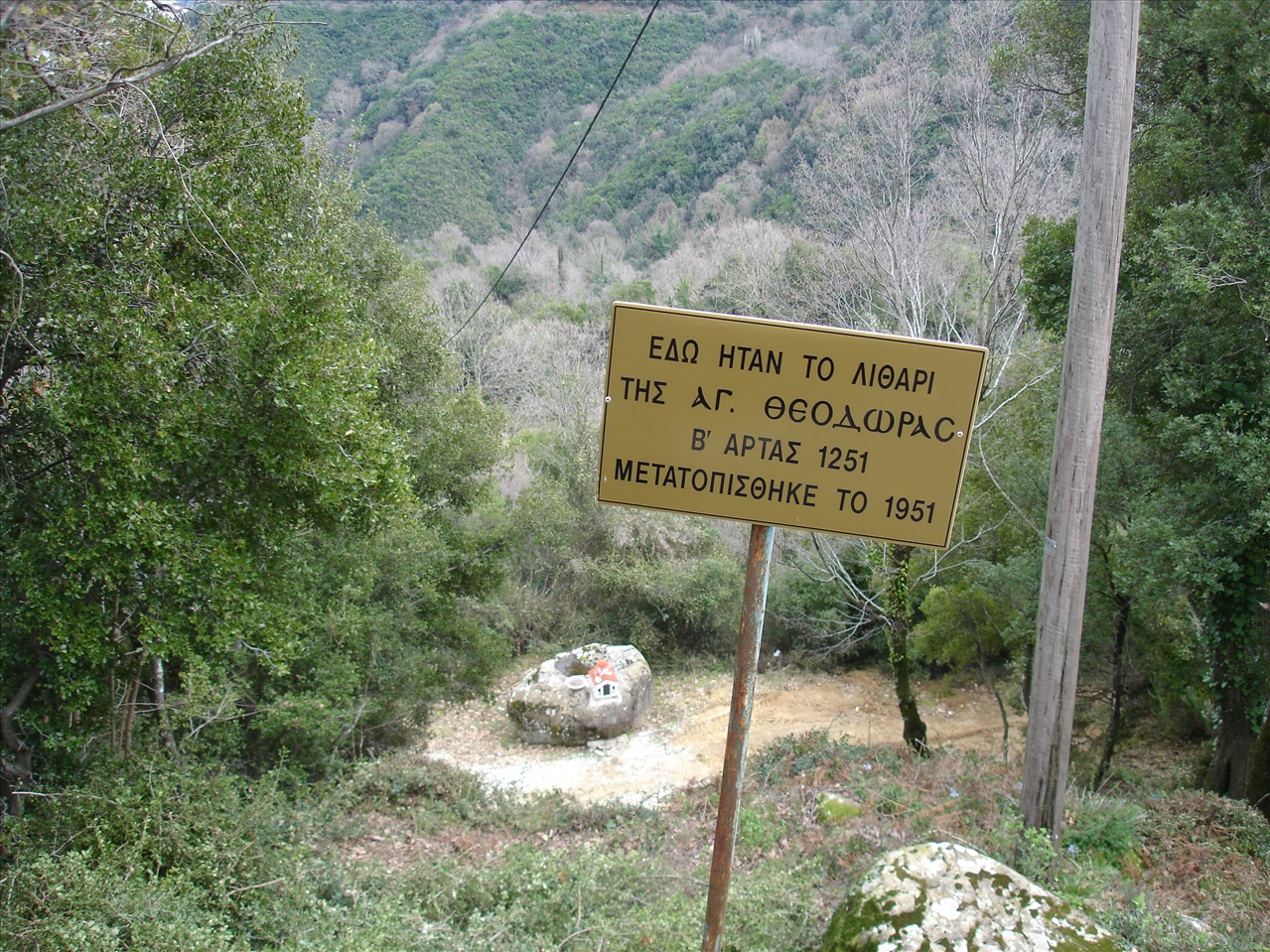 Έγερνε το φως και της άλλης μέρας. Η Θεοδώρα βρισκόνταν τώρα σε μια ψηλή κορυφή, απ' όπου πανοραμικά, ατένιζε πέρα τη βαθιά γραμμή του Αράχθου, έτσι όπως κυλούσε αμέριμνος ανάμεσα στα Αθαμανικά όρη. Δεν έβλεπε για πρώτη φορά η Θεοδώρα ένα παρόμοιο μεγαλόπρεπο θέαμα. Όμως η μαγεία αυτού του τοπίου την απέσπασε προσώρας από την τραγωδία της. Σε λίγο ερευνώντας τον ορίζοντα, ανατολικά, διαπίστωσε ότι προς τη μεριά εκείνη, δεξιά της, υπήρχε πλούσια βλάστηση μεγάλα δέντρα και κάποιο φυσικό απάγγειο… Ευθύς άρχισε να τρέχει προς την απέναντι απόκρημνη πλαγιά, πηδώντας μέσα από θάμνους, βράχια αιχμηρά, πουρνάρια, άγριες και σκληρές κουμαριές, έχοντας συνάμα το φόβο ότι θα την προλάβει η μπόρα και η νύχτα, πριν ανακαλύψει κάποιο προστατευτικό καταφύγιο… Σε λίγο βρέθηκε μπροστά σ΄ένα μισοερειπομένο μοναστηράκι. Ένα τοσοδά καθολικό ξυλόστεγης βασιλικής, με μερικά κελάκια που ήταν κολλημένα στη δυτική του πλευρά… πλησίασε το μοναστηράκι… χτύπησε απαλά την πόρτα. Και, ω του θαύματος, μια γερόντισσα μοναχή, αφού τράβηξε το μεγάλο σύρτη από μέσα, της άνοιξε.